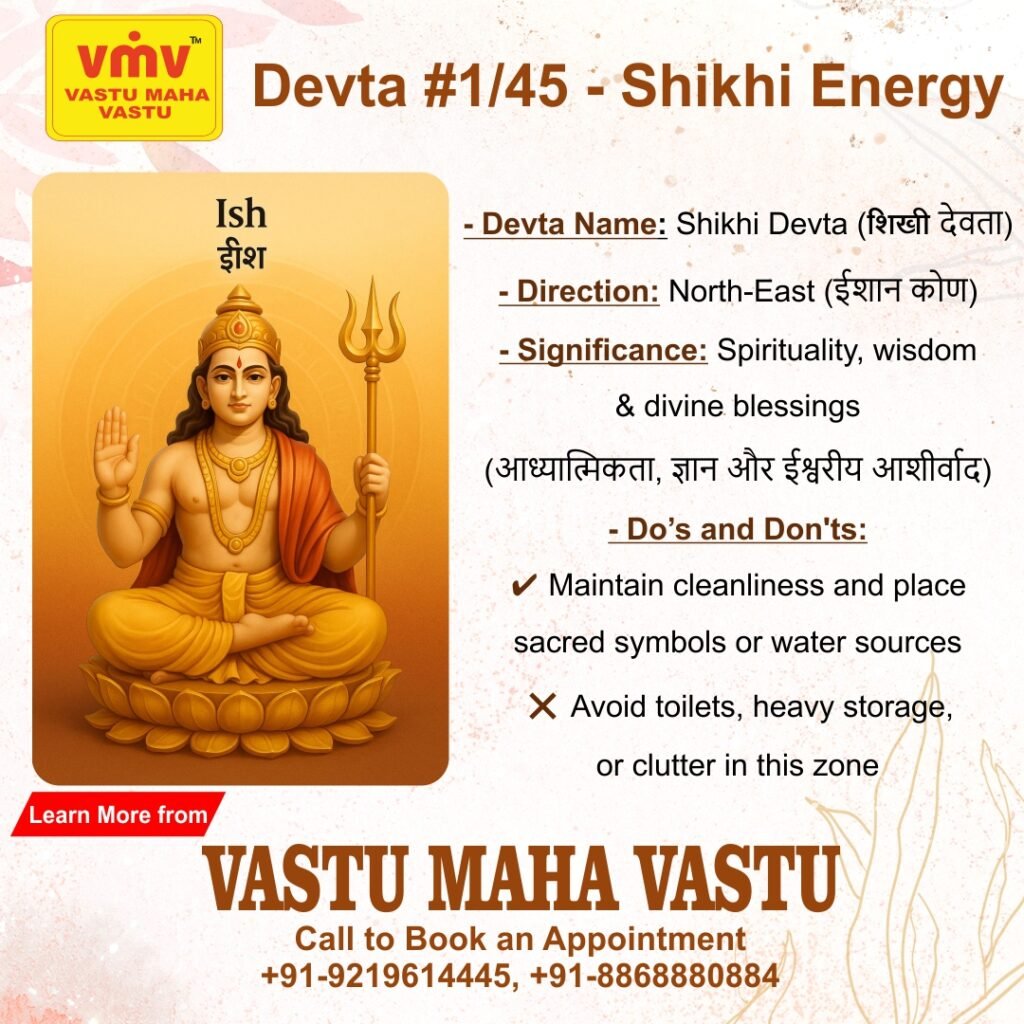 The North-East (ईशान कोण) is ruled by Ish Devta, symbolizing spirituality, wisdom, and divine blessings. This direction is considered the