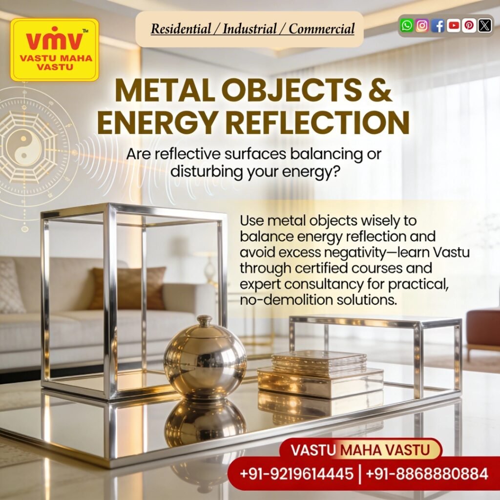 Metal surfaces—whether shiny décor, furniture frames, or decorative pieces—interact with energy by reflecting and amplifying it. This can be beneficial when balanced, but harmful when excessive or misplaced.